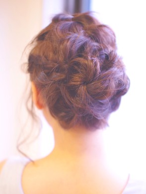編み込みですべてまとめたスタイルです。 顔周りに少し髪の毛を残してあげると小顔効果を出せます。